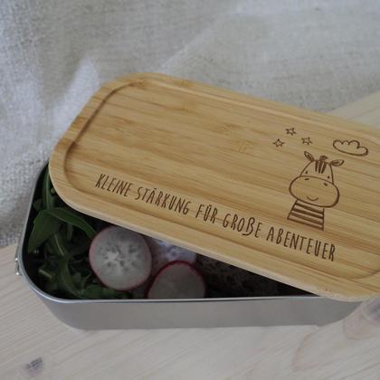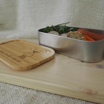 Eine außergewöhnliche Brotdose für die kleine Jause unterwegs. Diese Dose ist 100% recyclebar, nachhaltig, plastikfrei und natürlich auch personalisierbar. - Maße: 175x96x46mm - Material: Weißblech, Bambusholz - Personalisierbar mit Name/Geburtsdatum/… - Der Schriftzug bzw. das Symbol wird auf den Bambusdeckel graviert. - Die Dose ist NICHT für den Geschirrspüler bzw. für die Mikrowelle geeignet - Leichte Abweichungen zur Maserung, Farbe bzw. Gravurintensität sind naturbedingt und stellen keinen Reklamationsgrund dar. - Die Dose ist aus recyceltem Weißblech bzw. Bambus und somit absolut nachhaltig. - Bitte beachte die angefügten bzw. beigelegten Pflegehinweise – damit du länger Freude mit deiner Brotdose hast. PFLEGEHINWEISE Bitte gib diese Brotdose NICHT in den Geschirrspüler bzw. in die Mikrowelle. Für die Reinigung genügen Schwamm oder Haushaltstuch und Wasser. Bei stärkerer Verschmutzung einfach ein wenig Spülmittel nehmen, bitte sparsam einsetzen, da dieses zu einem schnelleren Abnutzen der Beschichtung beiträgt. Bitte trockne die Brotdose nach dem Reinigen gut ab, bzw. lass den Deckel stehend trocknen, damit beide Seiten gleichmäßig belüftet werden.