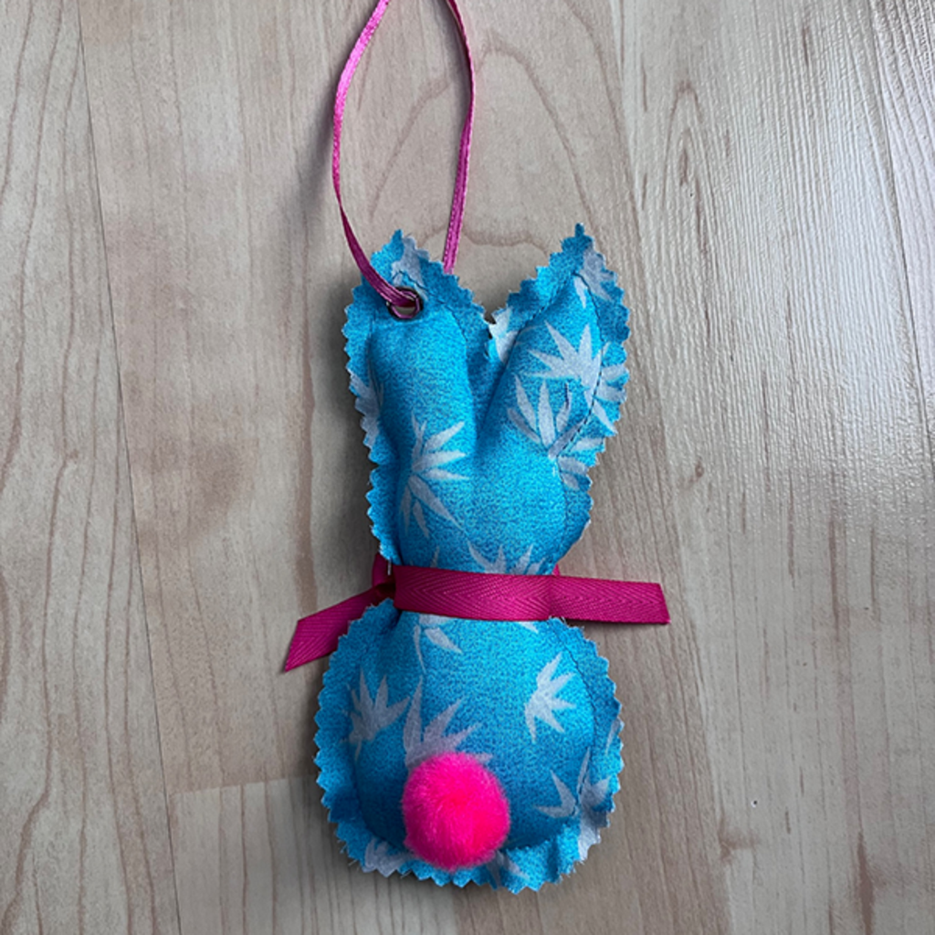 Hase aus Stoff zum Aufhängen, 16 cm hoch, 7,5 cm breit. Tw. mit Lavendel gefüllt. Auf der Vorderseite hat der Hase eine Masche, auf der Rückseite einen Bommel