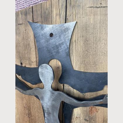 Jesus am Kreuz aus Stahl, montiert auf einen 200 Jahe alten Altholz Brett, Gr.62,5cm x 36cm