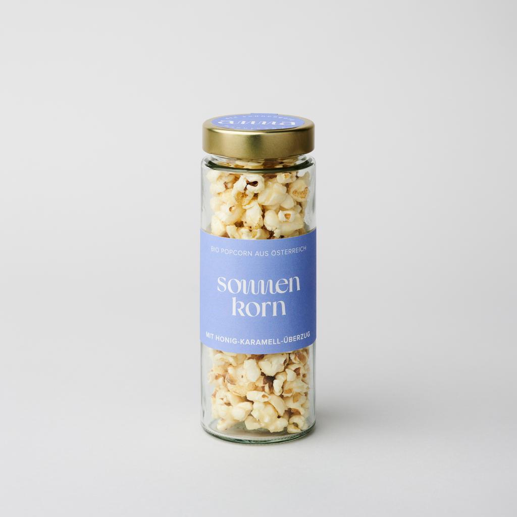 Bio Popcorn mit Honig-Karamell-Überzug Knuspriges Popcorn voll in love mit himmlischem Honig-Karamell - diese Liebe hält für immer. So eine Love-Story hättest du auch gerne? Mit Sonnenkorn isst dir deine Liebste/dein Liebster beim ersten Fernsehdate garantiert aus der Hand. Love-Story hin oder her, fest steht jedenfalls: Der knusprige Lifestyle-Snack sorgt auf jeder Party für unvergessliche Lieblings-Momente. Ab in die Schüssel und bring ein bisschen Knusper - äh Sonnenkorn - in eure Runde. Zutaten: 69% Honig-Karamellzubereitung* (Zucker*, Honig*, Butter*, Salz), 21% Mais*, Butter (14,8%)*, Rapsöl* * = Zutat aus kontrolliert biologischer Landwirtschaft Trocken, vor Licht und Wärme geschützt lagern. Durchschnittliche Nährwerte per 100g: Energie 2443 kJ/585 kcal, Fett 27g, davon gesättigte Fettsäure 10g, Kohlenhydrate 81g, davon Zucker 65g, Eiweiss 3g, Salz 0,5g