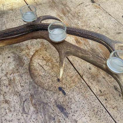 Stylisher Teelichterhalter aus 2 ineinander verschlungenen Abwurfstangen eines Hirschen für 4 Teelichter. Schöne Symbolik z. B. für Verliebte durch 2 ineinander verschlungene Geweihe. Ausgefallene Ganzjahresdeko für Tisch und Sideboard. In der Vorweihnachtszeit ideal als Adventkranz-Alternative.