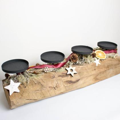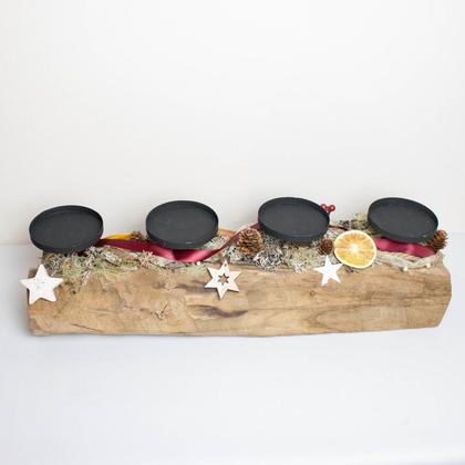 Dieser Adventskranz der etwas anderen Art besteht aus einem Stück Teakholz, welches mit viel Liebe zum Detail verziert wurde.