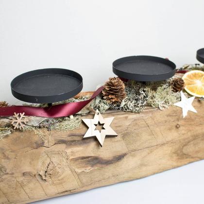 4 schwarze Metallkerzenhalter sind auf dem Teakholzstück angebracht.