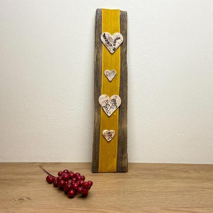 Das Altholzbrett wurde mit einem gelben Band und vier handgemachten Keramik-Herzen verziert.