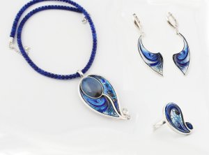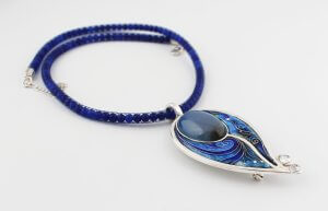 Exklusiver Cloisonné-Emaille-Anhänger und Brosche mit ovalem Opalith, gefertigt aus feinem Silber und kunstvoller Emaille. Das filigrane Muster aus handgelegtem Silberdraht ist mit harmonisch abgestimmten Blautönen ausgefüllt, die den schimmernden Opalith-Edelstein perfekt ergänzen.