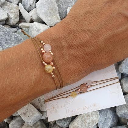 Von Hand gefertigtes Armband aus strapazierfähigem Makrameegarn (gewachst & wasserfest), mit natürlichen Edelsteinen (Mondstein/8mm, Rosenquarz & Citrin/6mm), 18k vergoldeten Kupferperlen & längenverstellbarem Schiebeverschluss zum individuellen anpassen