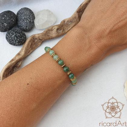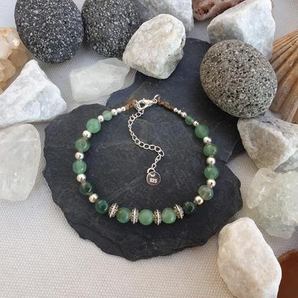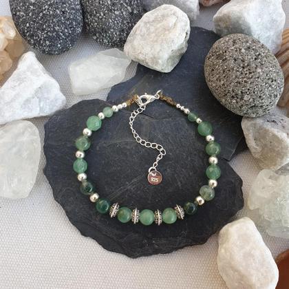 Mit Karabinerverschluss & 5cm Gliederkettchen aus 925 Sterlingsilber, sowie natürlichem Aventurin & Moosachat mit 6mm Durchmesser (Herzchakra zugeordnet), 4mm Hämatitperlen & Perlen aus tibet. Silber.