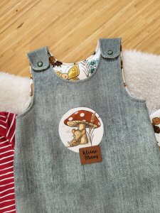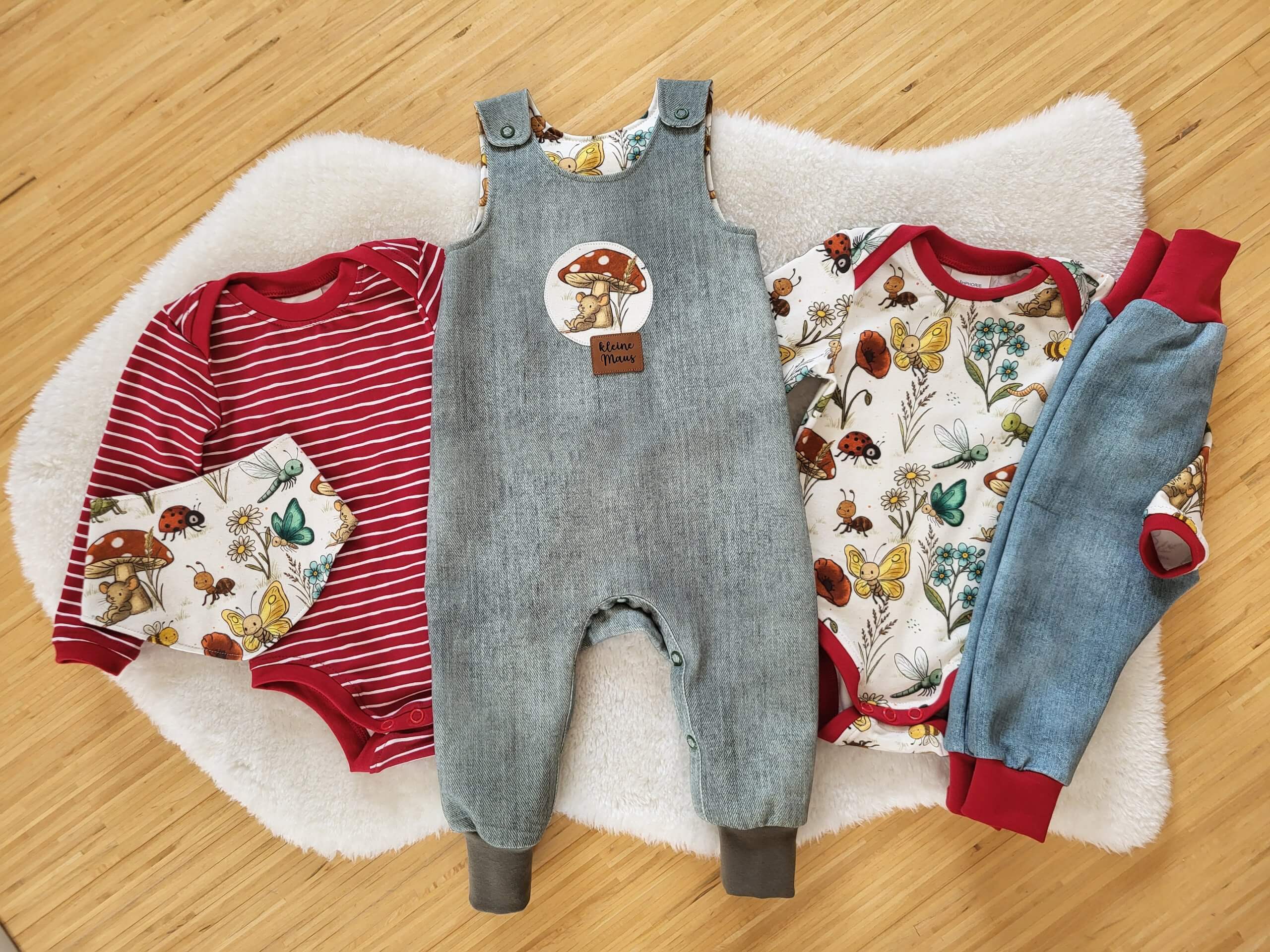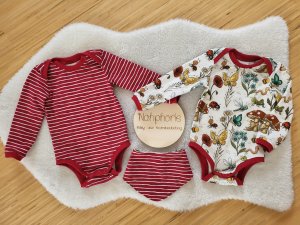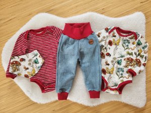 Farblich abgestimmt, aus weichem Biojersey bzw. der Strampler aus French Terry.