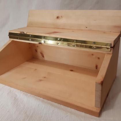 Die Brotdose lässt sich vorne durch eine Klappe öffen und ist so auch sehr leicht innen zu reinigen. Die Vorderseite ziert ein geschnitzer Brotleib.