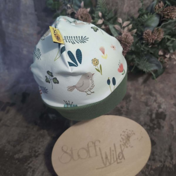 Bündchenhaube „Frühlingswiese“ – Mitwachsende Leichtigkeit für kleine Naturfreunde 🌸🌿🐦