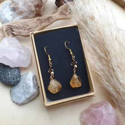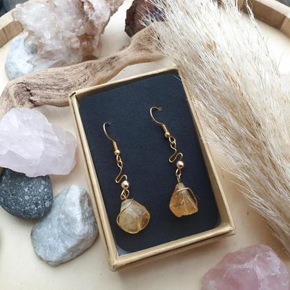 Kraftvoller Ohrschmuck mit natürlichem Citrin in unregelmäßiger & einzigartiger Form. Mit Ohrhaken aus hochwertig vergoldetem Edelstahl (nickelfrei), hangebogener, vergoldeter Edelstahldraht &