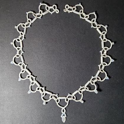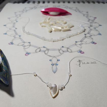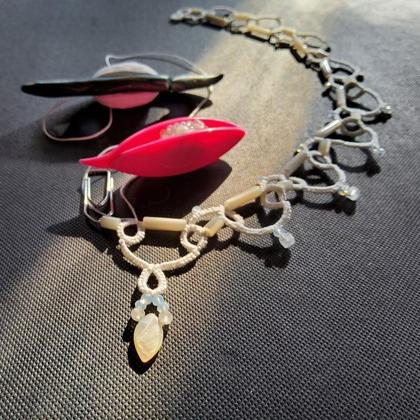 Das --Collier Cora-- aus weißem --Baumwollgarn--, --Perlmuttstiften-- und --Regenbogenmondstein-- wünscht sich ein edle Umgebung. Sie verträgt sich gut mit weißer Kleidung, z.B. einem Brautkleid oder Sommerkleid. Aber ebenso ein Platz an einem eng anliegenden dunklen Rolli gefällt ihr gut.