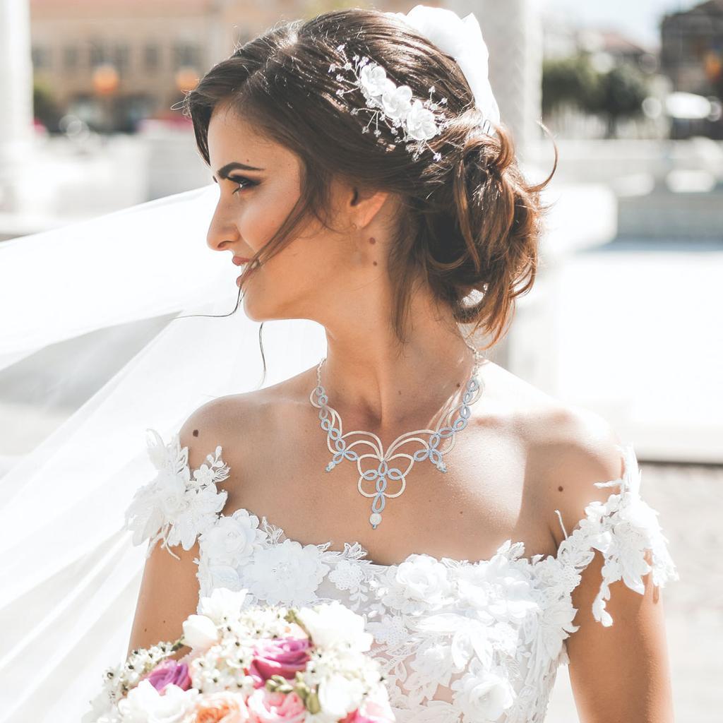 Bezauberndes --Collier-- aus feiner Schiffchenspitze, welches durch ein romantisches florales Muster besticht und mit funkelndem und --gecrashtem Bergkristall-- und --facettiertem Aquamarin-- kombiniert wurde. Handgearbeitet aus weißer und himmelblauer Baumwolle, ist dieser Schmuck ein Blickfang für jeden Anlass. Der Karabinerverschluss besteht aus 925 Sterling Silber. Perfekt für sommerliche Outfits und Hochzeitslooks. Ein Accessoire, das Ihren Look vollendet.