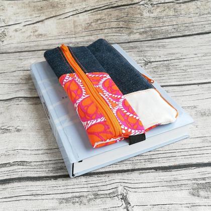 Ins vordere Etui passen z.B. Stifte, das hintere hat zwei Reißverschlussschieber, sodass es auch aus der Mitte geöffnet werden kannm und ist mit abwaschbarem Kunststoffgewebe gefüttert - z.B. für eine Gesichtsmaske. So kann das Futter nach Verwendung ausgewischt und desinfiziert werden.