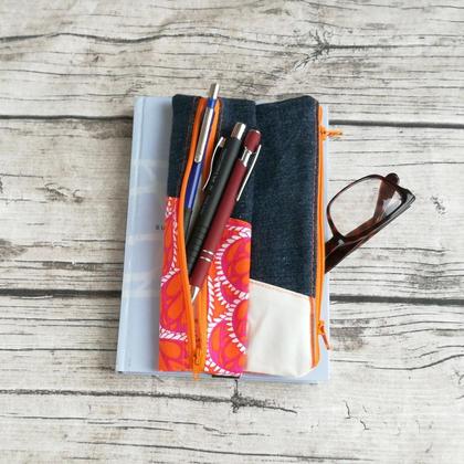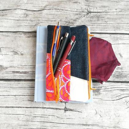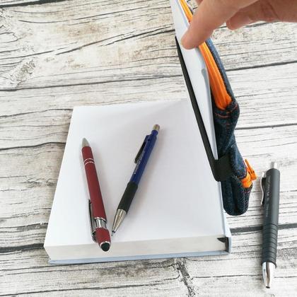 Das Doppel-Pennal mit seinen zwei Reißverschluss-Etuis kann mittels Gummi auf einen A5-Block geklemmt werden und ist so immer zur Hand.