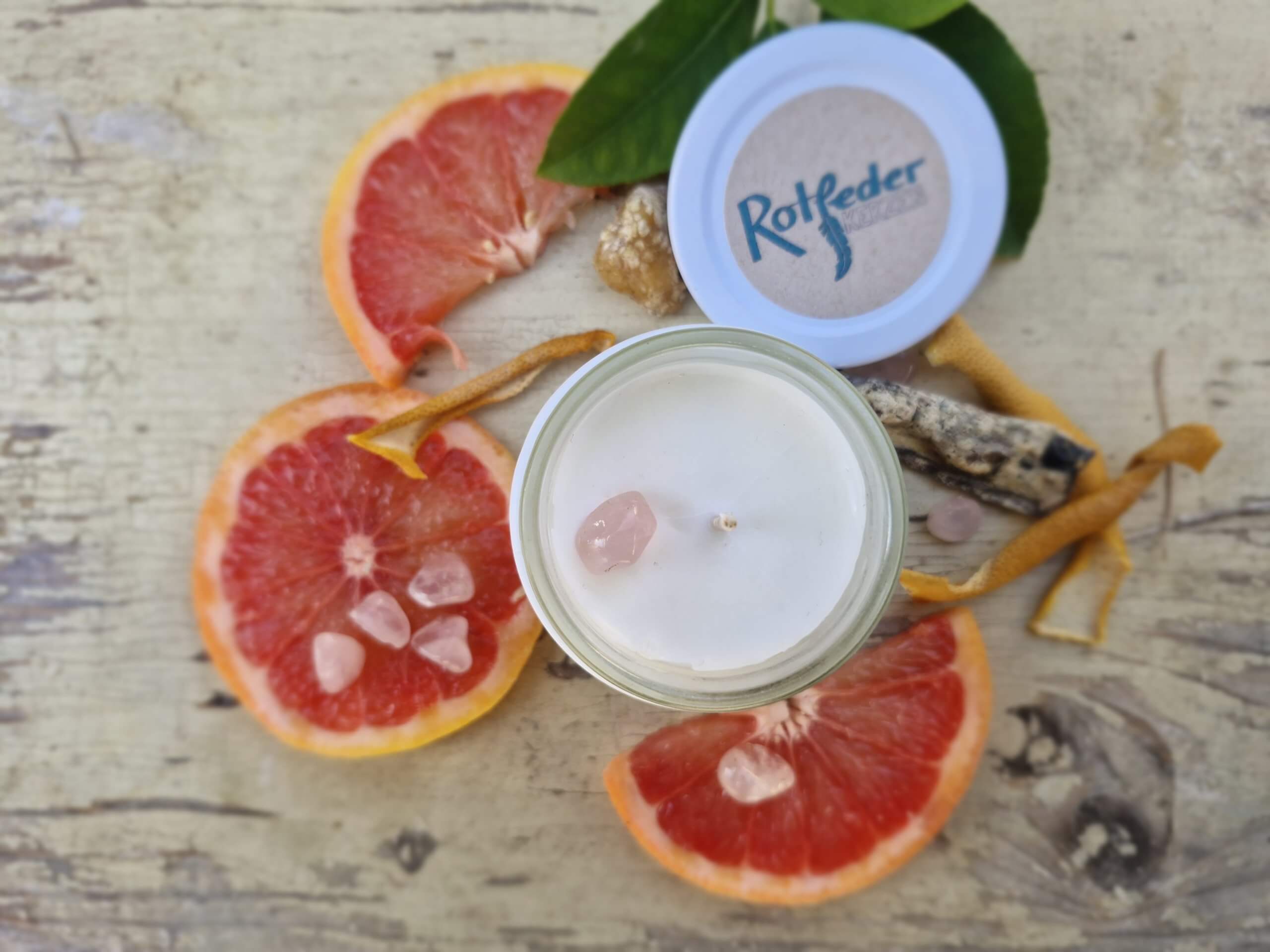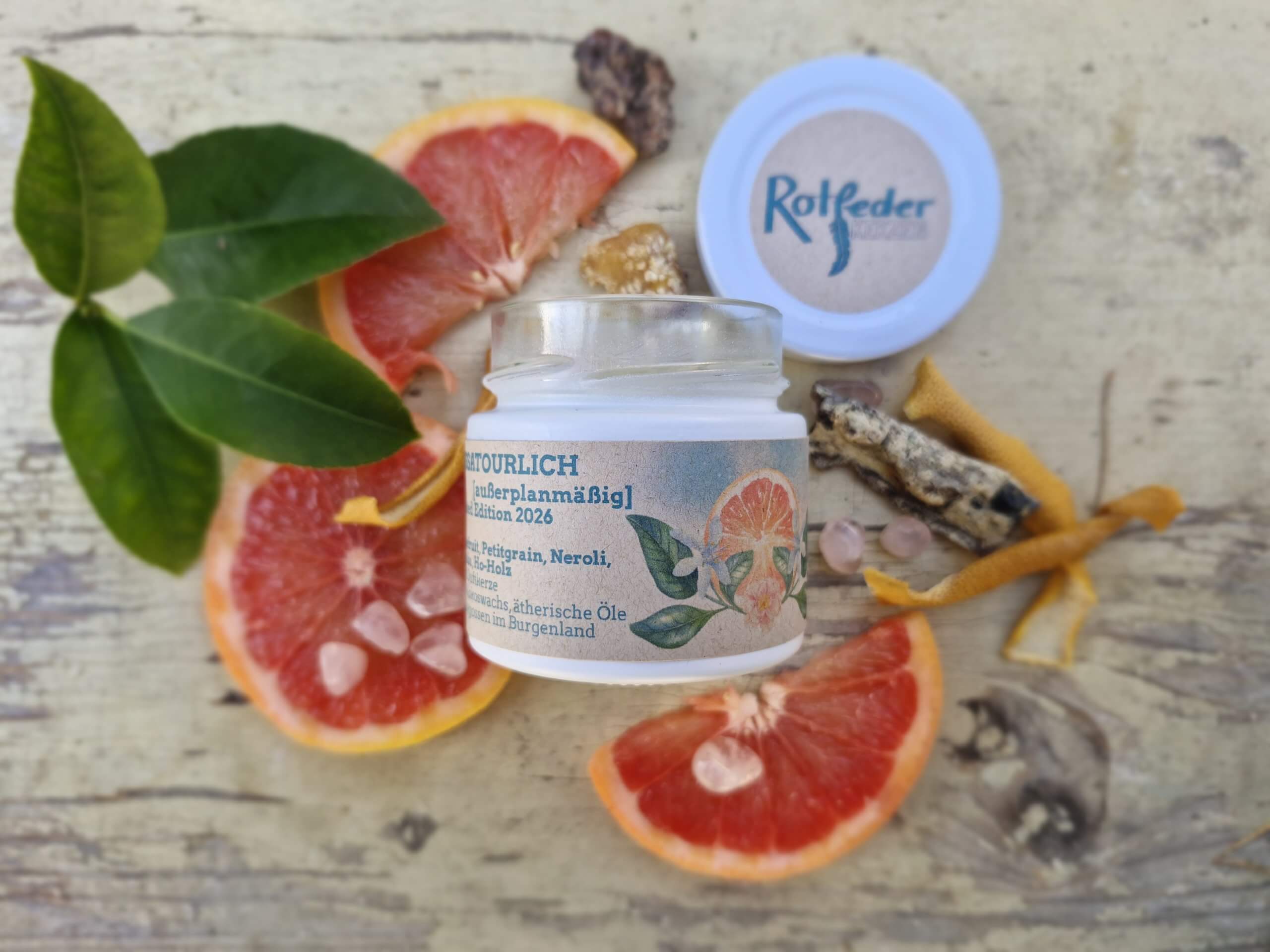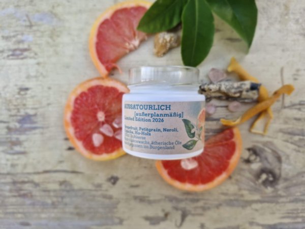 Duftkerze "Aussatourlich" im weissen 125ml Glas mit weissem Deckel. Die Kerze besteht aus pflanzlichem Rapswachs, einem Baumwolldocht, sowie einer Mischung aus ätherischen Ölen, und einem kleinen Rosenquarz Trommelstein als Deko. Rosenquarz steht für Harmonie, Liebe und Vertrauen, der Stein kann nach dem Abbrennen der Kerze natürlich weiterverwendet werden bzw. schon vorher rausgenommen werden.  Manchmal hat man Ideen, die müssen sofort umgesetzt werden- hier ist also "Aussatourlich" [Ausserplanmässig], meine limiterte Duftkerze für das Jahr 2026. Die Duftmischung ist wie bei all meinen Kerzen selbstkreiert, und enthält eher herbere Öle, wie mein Lieblingsduft Grapefruit,  mit denen ich sonst weniger arbeite. Wer also auf der Suche nach einem eher aussergewöhnlichen Duft ist, wird hier fündig.  Brenndauer ca. 25+ Stunden. Vegan und paraffinfrei. Handgemacht in Österreich aus natürlichen Rohstoffen. Nachhaltig und umweltfreundlich. Der Duft besteht aus folgenden Komponenten: Grapefruit- spritzig, bittersüß, fruchtig, kann bei Stress und Müdigkeit helfen, zur Luftverbesserung. Neroli- Öl aus Orangenblüten, warm, blumig-zart, "Balsam für die Seele". Petit Grain- Öl aus Blättern, Zweigen und unreifen Früchten von Zitruspflanzen, frisch, holzig, kann bei Konzentrationsschwäche, Angst, Erschöpfung usw. helfen.  Copaiba- Harz, fein-würzig, balsamisch, wirkt anregend, beruhigt das Nervensystem. Ho-Holz- rosig, blumig, wirkt harmonisierend, kann zur Beruhigung und Entspannung angewendet werden.  Ein paar Hinweise zum richtigen Umgang mit meinen Kerzen: -beim ersten Abbrennen das Wachs bis zum Rand schmelzen lassen, damit die Kerze auch später gut abbrennt -optimale Brenndauer zwischen 1 und 4 Stunden -Docht regelmäßig kürzen -Zugluft vermeiden -Kerze nie unbeaufsichtigt brennen lassen -Achtung! Glas wird heiß, daher am besten auf eine nicht brennbare Unterlage stellen. -ätherische Öle und Duftöle können allergische Reaktionen hervorrufen, bitte vorher informieren! Aufgrund der natürlichen Rohstoffe kann die Kerze an der Oberfläche nach dem Abbrennen Dellen, kleine Löcher etc aufweisen. Dies mindert die Qualität der Kerze in keinem Fall, im Gegenteil, es zeigt, dass auf schädliche Zusätze verzichtet wurde.