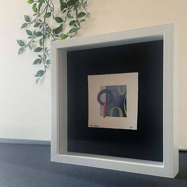 Ein weißer Objektrahmen 24 x 24 cm verleiht der am Hintergrund schwebenden Collage zusätzliche Tiefe.