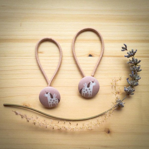Die Haargummis sind 2,5 mm dick und haben einen Durchmesser von 4,5 cm, der runde Knopf-Teil von 2,3 cm. Der Knopf besteht aus Metall, der überzogene Teil aus 100 % Bio-Baumwolle (GOTS zertifziert).