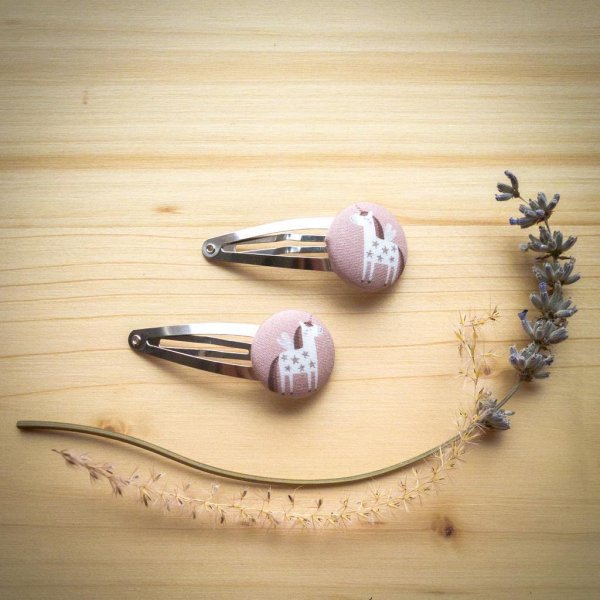 Die Haarclips sind 5,5 cm breit, der runde Knopf-Teil hat einen Durchmesser von 2,3 cm. Der Clip besteht aus Metall, der überzogene Teil aus 100 % Bio-Baumwolle (GOTS zertifziert).