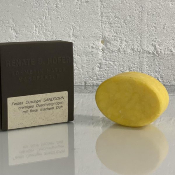Das feste Duschgel Sanddorn mit dem herrlichen Duft von Orangenblüten hat ein tolles Schaumverhalten.