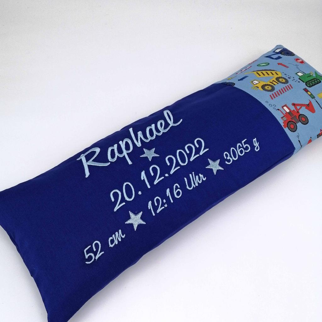 Zum ShopGeburtskissen/Erinnerungskissen Bagger mit Echtmaßen/Geschenk zur Geburt Baby