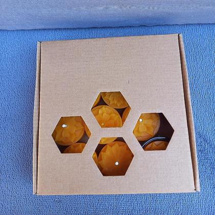 Das Geschnkeset beinhaltet 7 Bienenwachs Teelichter und ein Teelichtglas.