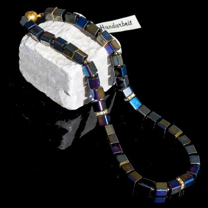Diese elegante Halskette wurde aus schimmernden, irisirenden Glaswürfeln (Kantenlänge etwa 8mm) und Straßrondellen gefädelt und hat einen goldfarbenen Magnetverschluss. Länge 48cm.