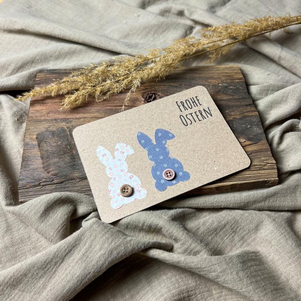 Die Karte besteht aus braunem Kraftpapier und hat zwei kleine Osterhasen aus buntem Papier auf der Vorderseite. Ein besonderer Hingucker sind die beiden kleinen braunen Knöpfe.