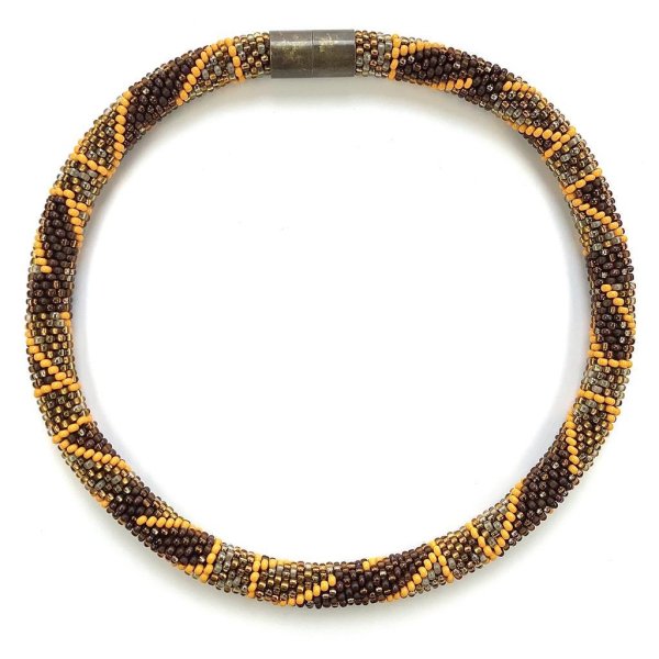 In dieser traditionellen Technik des Häkelns von Glasperlen werden für diese Halskette 2500 orange und braune Glasperlen nach einem von mir entworfenen Muster auf ein Baumwollgarn gefädelt.