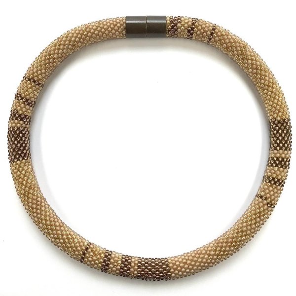 In dieser traditionellen Technik des Häkelns von Glasperlen werden für diese Halskette 2500 sandfarbene und metallisierte hellbraune Glasperlen nach einem von mir entworfenen Muster auf ein Baumwollgarn gefädelt.
