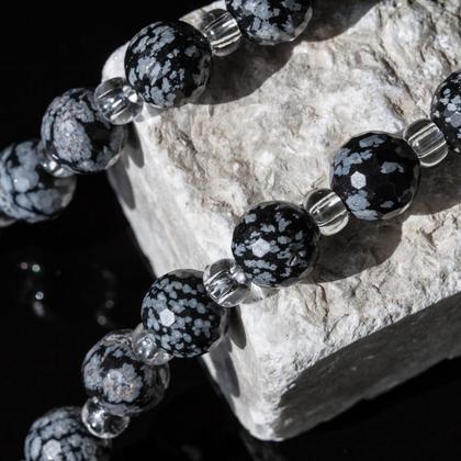 Das elegante Schmuckstück wurde mit Schneeflocken-Obsidian in Kugelschliff (etwa 12mm Durchmesser) und Kugeln aus Bergkristall (Durchmesser 4mm) gefädelt.