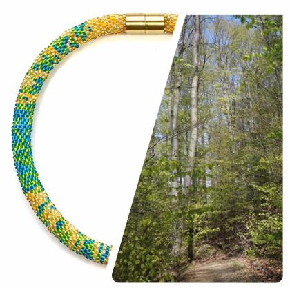 In dieser traditionellen Technik des Häkelns von Glasperlen werden für diese Halskette 2500 Glasperlen nach einem von mir entworfenen Muster auf ein Baumwollgarn gefädelt. Jede gefädelte Perle wird schließlich einzeln zu einem Schlauch gehäkelt.