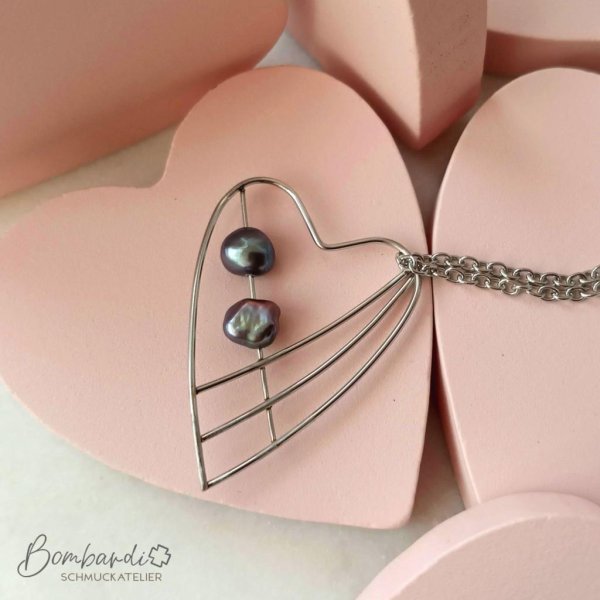 Diese Kette mit einem handgefertigten, filigran gestalteten Herzen, veredelt mit zwei unterschiedlichen Perlen in zarten Grau/Violett/Grüntönen symbolisieren nicht nur Zuneigung sondern stehen für ein klassisch elegant interpretiertes Herz.