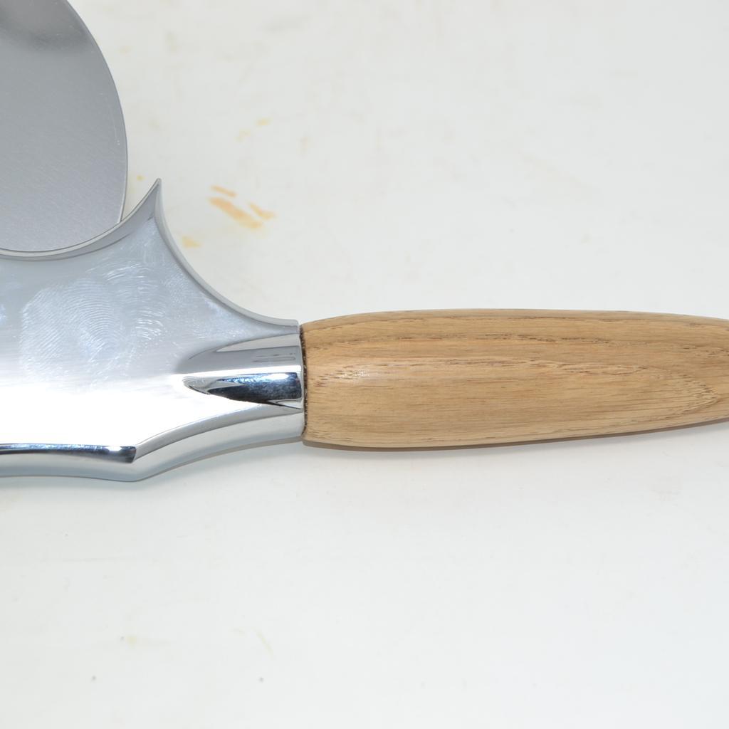 Massive --Pizzaschneider-- mit Edelstahlklinge und Holzgriff aus Eiche.