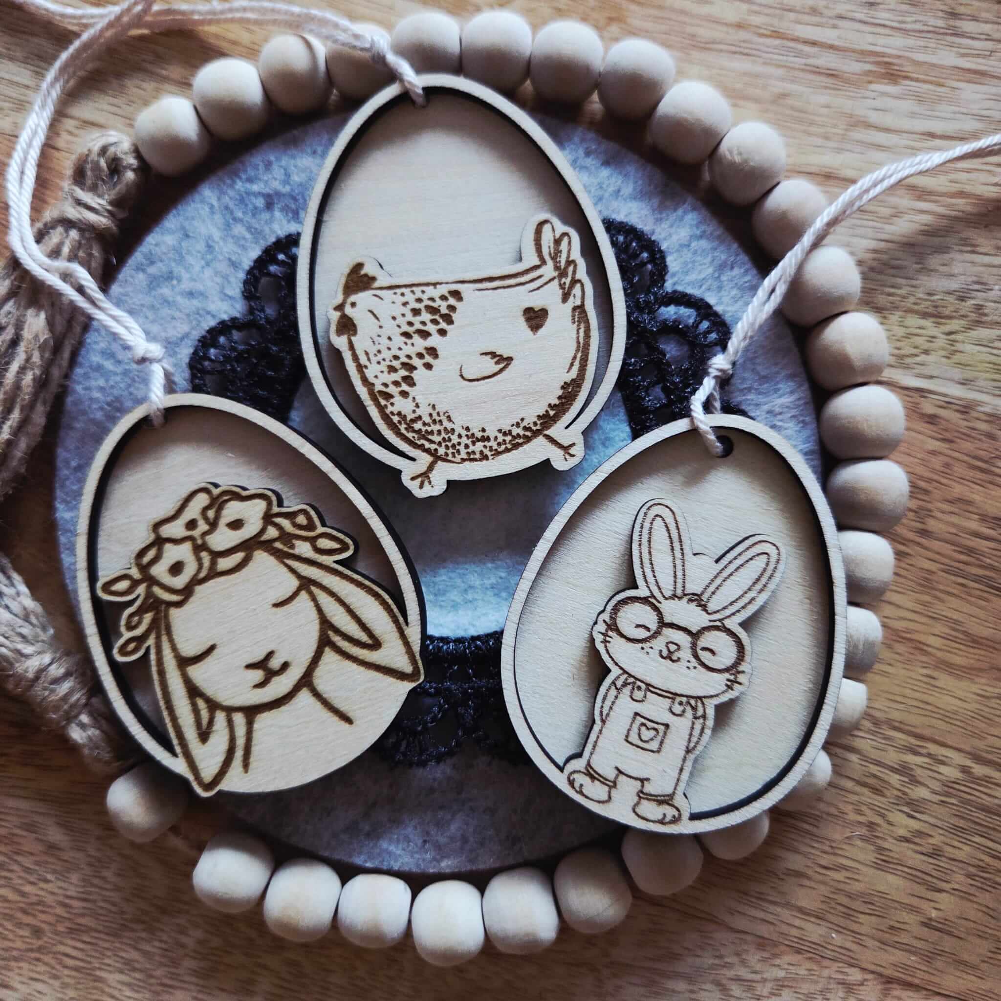 Du bekommst hier drei Ostereier aus Lindenholz gelasert, mit hochwertiger Gravur. Die Eier sind ca 6.5 x 4 cm groß und 5mm dick. Sie werden an einer Kordel befestigt und haben noch als Deko eine Holzperle.