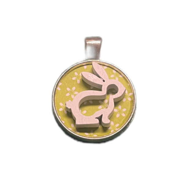 Cabochon mit buntem Papier und Holzhasen