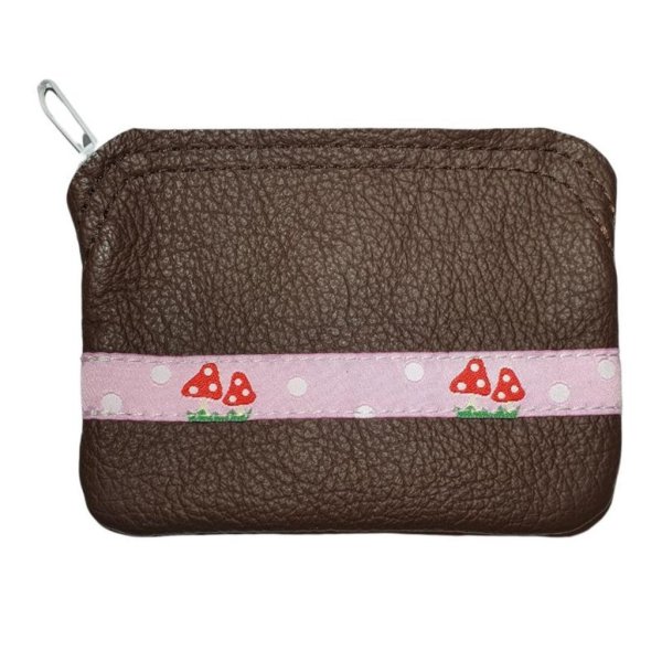 Das Börserl ist aus echtem Leder genäht und auf der Vorderseite schmückt es ein Webband mit süßen Fliegenpilzen.