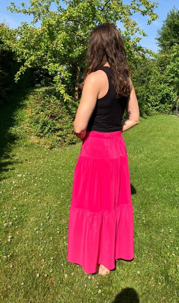 Der lange Stufenrock ist ein Meisterwerk der Handarbeit. Die Seide sorgt für einen angenehmen Tragekomfort und eine einzigartige Optik. Der Rock ist vielseitig und kann für verschiedene Anlässe getragen werden.