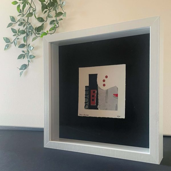 Ein weißer Objektrahmen 24 x 24 cm verleiht der am Hintergrund schwebenden Collage zusätzliche Tiefe.