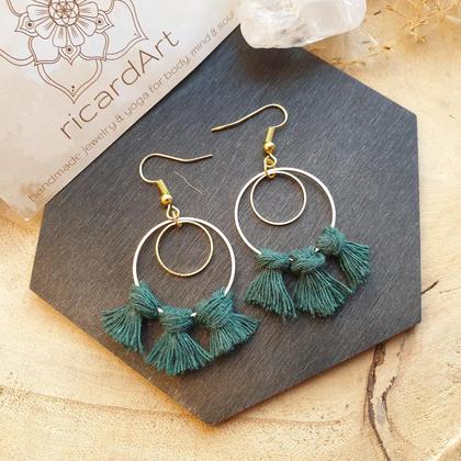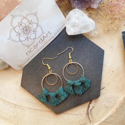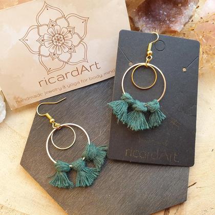 Von Hand gefertigte Makrameeohrringe im Boho-Stil, umknüpft mit dunkelgrünem Makrameegarn aus Baumwolle. Nickelfreie Ohrhaken aus vergoldetem Edelstahl & Messinghoops mit 30mm Durchmesser
