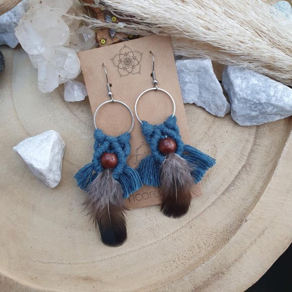 Von Hand gefertigte Ohrringe, handgeknüpft mit petrolfarbenem Makrameegarn aus recycelter Baumwolle, bestückt mit natürlichen Federn & Holzperle. Die Ohrhaken sind nickelfrei & somit auch für sensible Ohren geeignet.