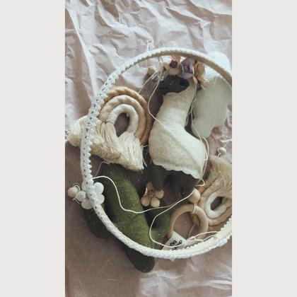 1 x Holzbügel mit Boho-Kranz aus Baumwolle gestrickt