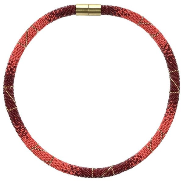 In dieser traditionellen Technik des Häkelns von Glasperlen werden für diese Halskette etwa 5500 korallrot und weinrote Glasperlen und goldfarbene schimmernde Glasperlen nach einem von mir entworfenen geometrischen Muster auf ein Baumwollgarn gefädelt.