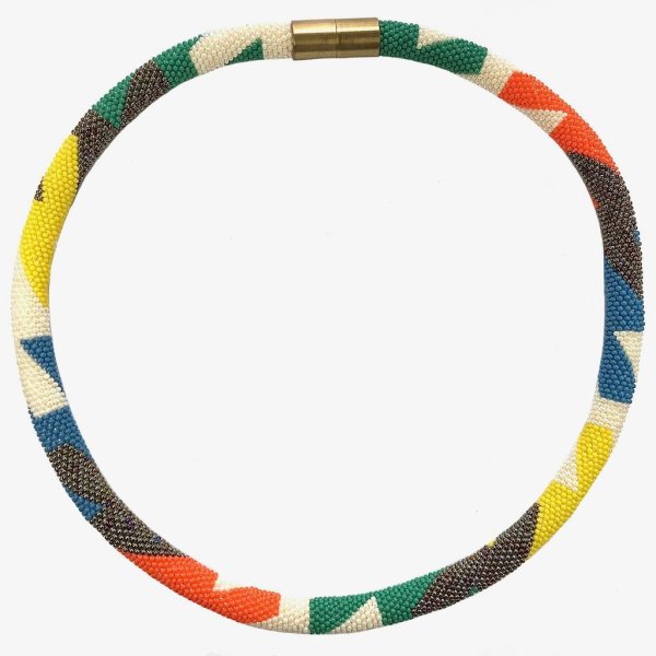 In dieser traditionellen Technik des Häkelns von Glasperlen werden für diese Halskette etwa 5500 bunte Glasperlen und metallisch schimmernde Glasperlen nach einem von mir entworfenen geometrischen Muster auf ein Baumwollgarn gefädelt.