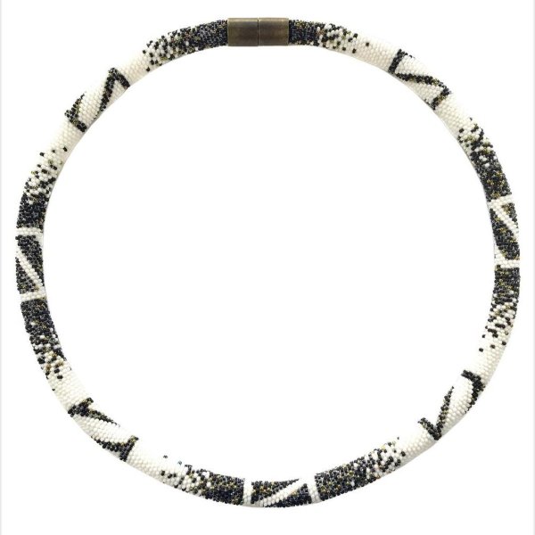 In dieser traditionellen Technik des Häkelns von Glasperlen werden für diese Halskette etwa 5300 schwarze und weiße Glasperlen und metallisch schimmernde Glasperlen nach einem von mir entworfenen geometrischen Muster auf ein Baumwollgarn gefädelt. Jede gefädelte Perle wird schließlich einzeln zu einem Schlauch gehäkelt.