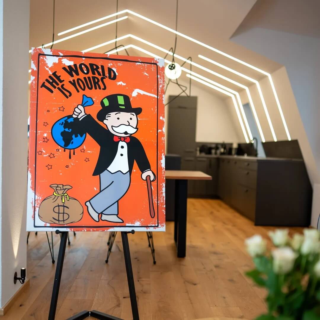 Der ikonische Gentleman mit Zylinder, Geldsack und der Weltkugel vor leuchtend orangem Hintergrund erinnert dich täglich daran: Die Welt gehört den Mutigen.