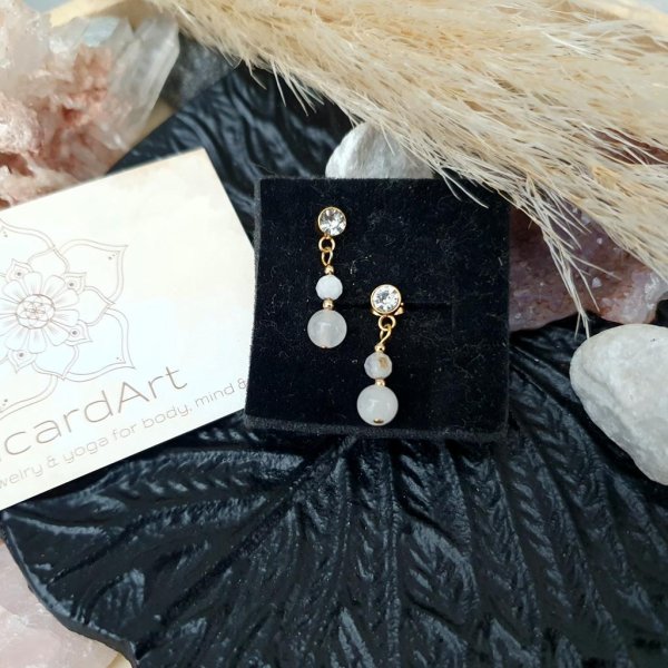 Elegante Ohrschätze mit nickelfreien Strassohrsteckern aus hochwertig vergoldetem Edelstahl, facettierten Mondsteinperlen (4mm) & Bergkristallen (6mm). Länge: ca. 3cm