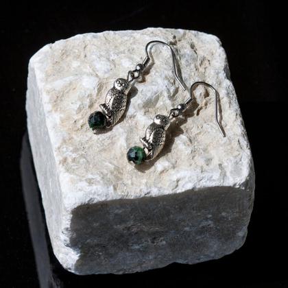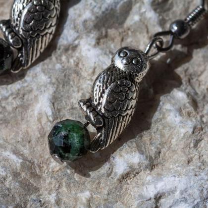 Ohrhänger mit Rubin-Zoisit-Kugel und voll ausgeformter Eule.