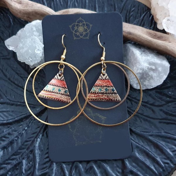 Messinghoops mit 40mm äußerem Durchmesser kombiniert mit farbig gemustertem Dreiecksanhängern. Die Ohrhaken aus vergoldetem Edelstahl sind nickelfrei, wasserfest & auch für sensible Ohren geeignet.