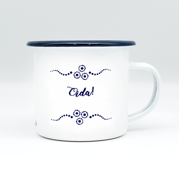 //Emaillierte Blechtasse mit dunkelblauem Rollrand | Fassungsvermögen 330ml (12oz) | Handwäsche empfohlen – nicht spülmaschinenfest, nicht mikrowellengeeignet//